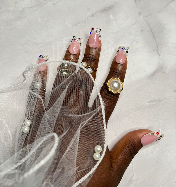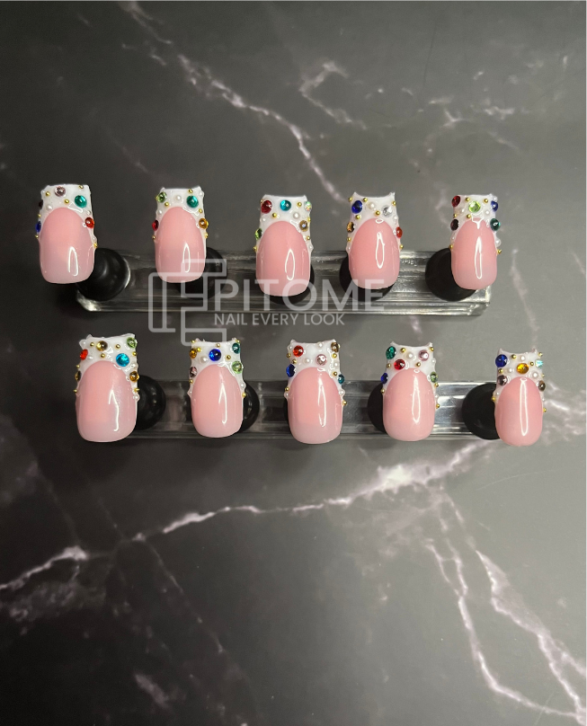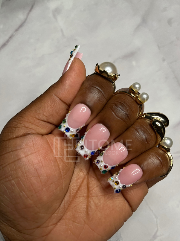 French Tip Press On Nails With Festive Rhinestones | Square Shaped